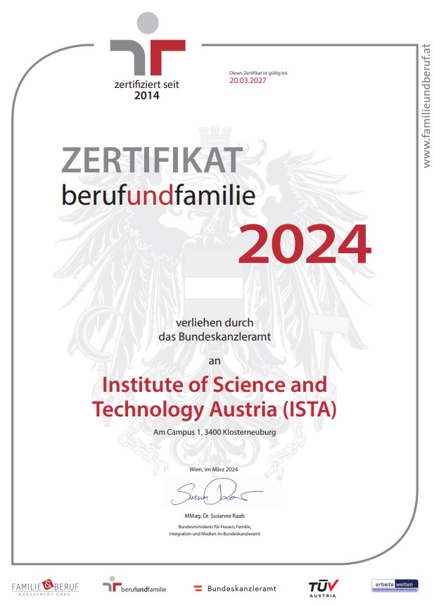 To this aim, ISTA participates in the Work and Family Audit since 2014. This 3-year Audit cycle helps organizations to evaluate and implement family-friendly measures under the supervision of the Federal Ministry for Women, Family, Integration and Media.