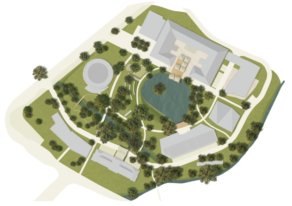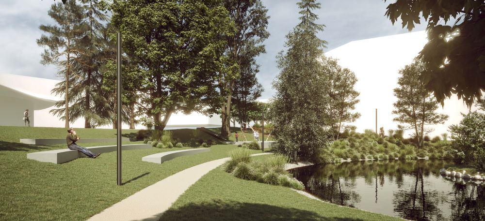 As part of the work on the VISTA Science Experience Center, the surrounding park has been redesigned and enhanced. With additional greenery, a gently sloped pond shore, and generously designed seating areas, it offers employees and guests a place for relaxation, recreation, and exchange.